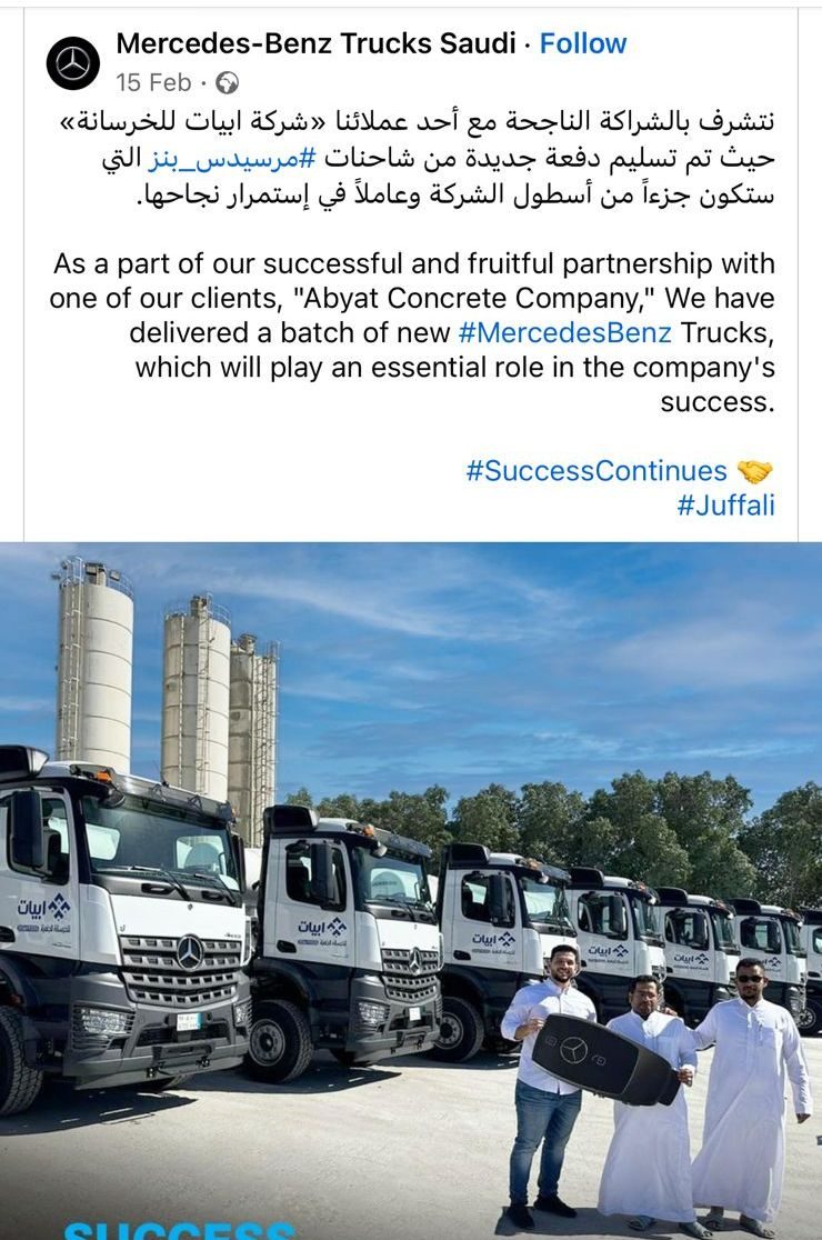تعتبر من اكبر الشركات بمدينة جدة وبأحدث المعدات وبأطقم فنيه وأدارية على أعلى مستوي وخبرات عاليه في هذا المجال - وقد تم شراء أحدث المعدات الجاهزة في العالم وخاصة أوروبا ‎. وتم أنشاء أول مصنع للشركه في مدينة جدة وبطاقه انتاجيه 80.000 م3 شهريًا بخلطات مختلفه القوه ولجميع المشروعات بمختلف ارتفاعاتها - عدد (5) محطات ليبهير الماني بطاقه انتاجيه 600م3/ ساعه وبطاقه تخزين للاسمنت 3500 طن + 300 طن ميكروسيلكا. عدد (1) مصنع لانتاج المياه المبرده والثلج هورمان الماني بطاقه انتاجيه 1000م3/ يوم والمياه بدرجه حراره 4 درجه مئويه و150 طن ثلج / يوم وذلك لانتاج الخرسانه الجاهزه حسب المواصفات العالميه والسعوديه وجميع المشروعات الخاصه ذات المواصفات الخاصة - ‎ عدد (11) مضخات خرسانه kcp + everdigm + putzmaister صناعات اوروبيه بمقاسات مختلفه بدايه من طول 42 م وحتي 70 م وذلك لخدمه جميع المواقع الخرسانيه - عدد (2) مضخه ثابته ترفع حتي 400 متر وعدد (2) بوم متحرك بطول 32 م - ‎عدد (70) خلاطه الماني وفرنسي وسويدي  بسعه 12 م3 للخلاطه الواحده - ‎كما يوجد بالمصنع منطقه للتشوينات الخاصه بالمواد تغطي انتاج 16000م3  مغطاه ومعزوله عزل حراري للحفاظ علي تخفيض درجه حرارة المواد الاوليه والخاصه بالانتاج وحمايتها من الاتربه.